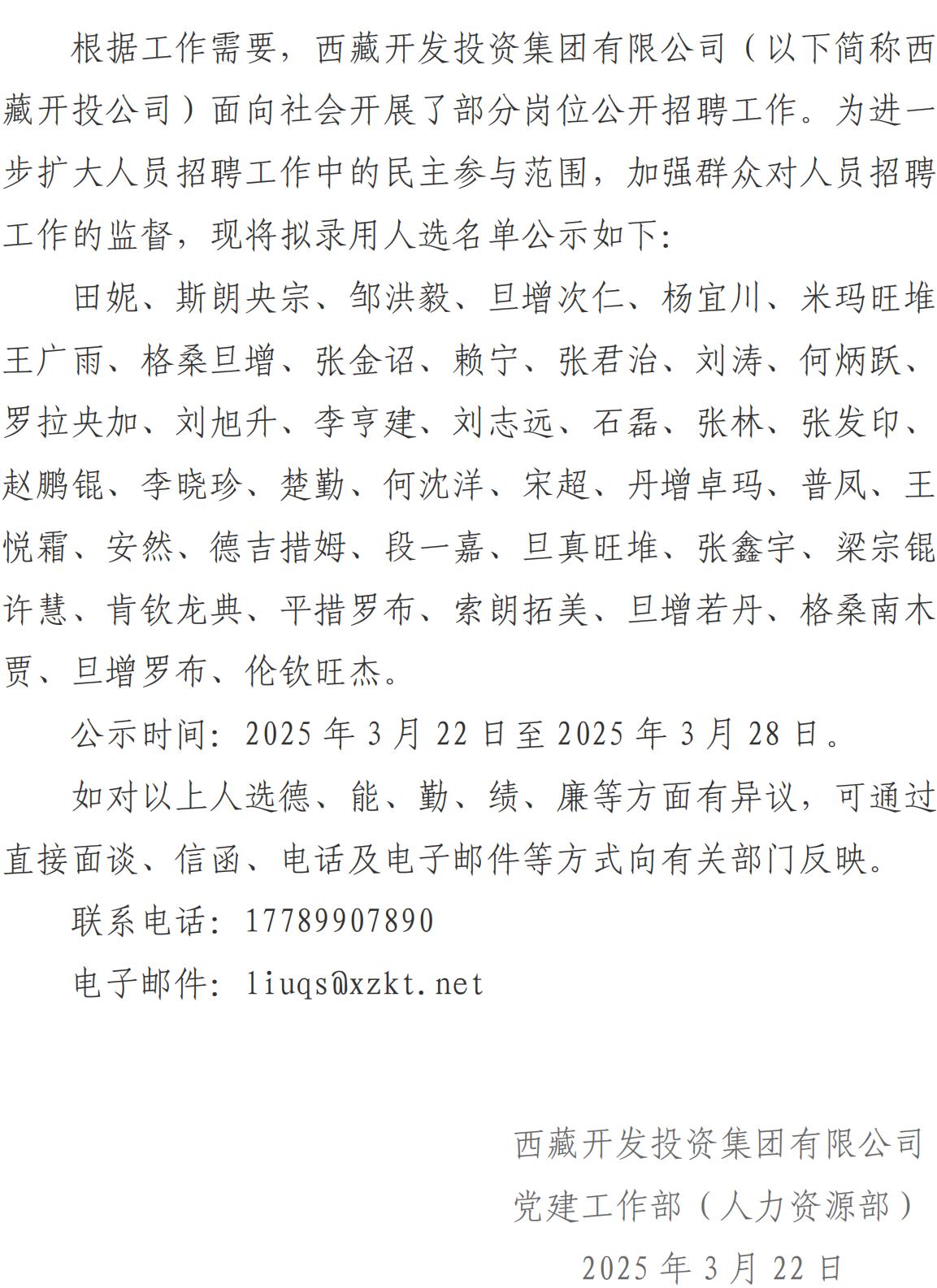 西藏開發(fā)投資集團(tuán)有限公司2024年11月社會(huì)招聘擬錄用人員公示