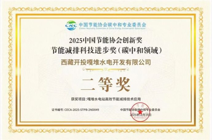近日,中國節(jié)能協(xié)會2025年度創(chuàng)新獎獲獎名單正式公布,西藏開投嘎堆水電公司申報的“嘎堆水電站高效節(jié)能減排技術(shù)應用”項目榮獲“節(jié)能減排科技進步獎(碳中和領域) 二等獎”。