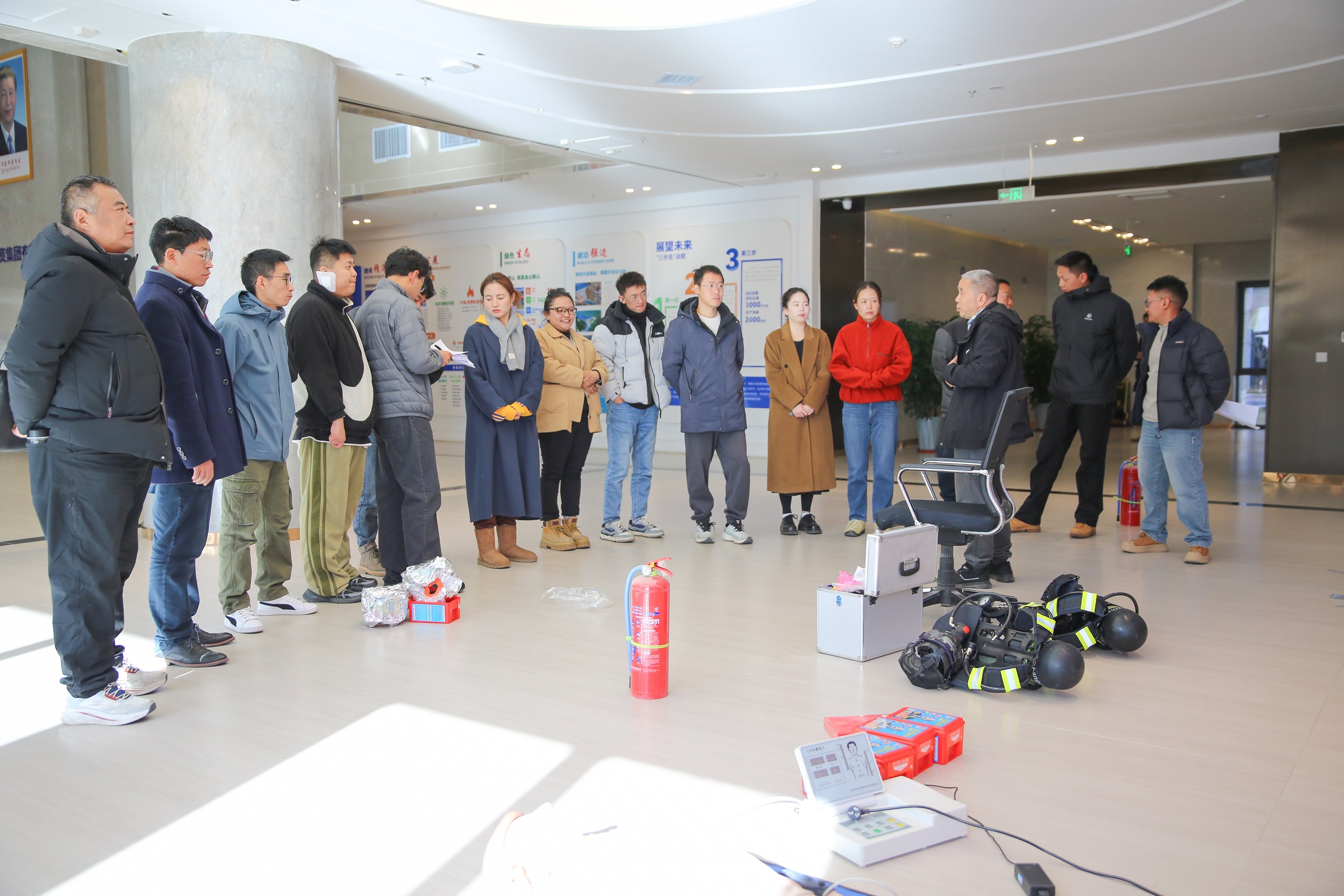 在“實操實訓”環(huán)節(jié),技能訓練分區(qū)域同步開展:急救技能區(qū)聚焦高原環(huán)境特點,開展心肺復蘇與創(chuàng)傷包扎專業(yè)指導訓練;安全防護裝備區(qū)強化正壓式空氣呼吸器、防毒面具等裝備的規(guī)范使用訓練;消防實訓區(qū)則組織滅火器與滅火毯分組實操,全面提升員工應急處置能力。