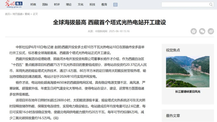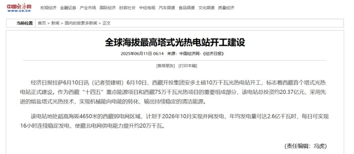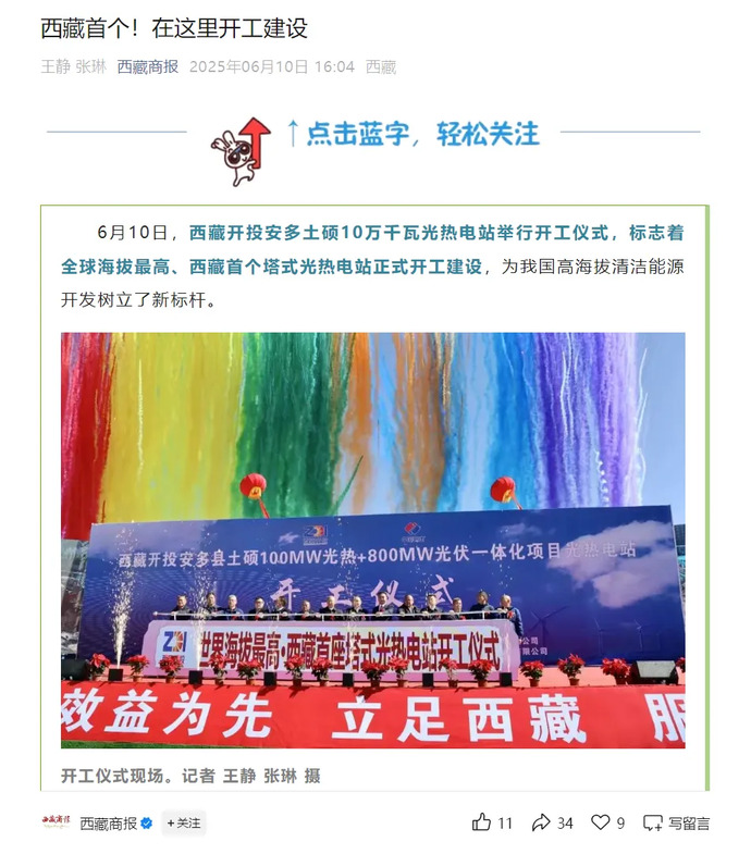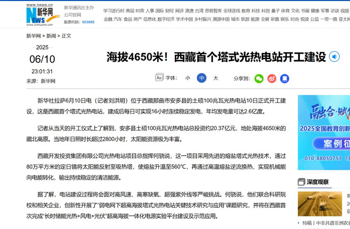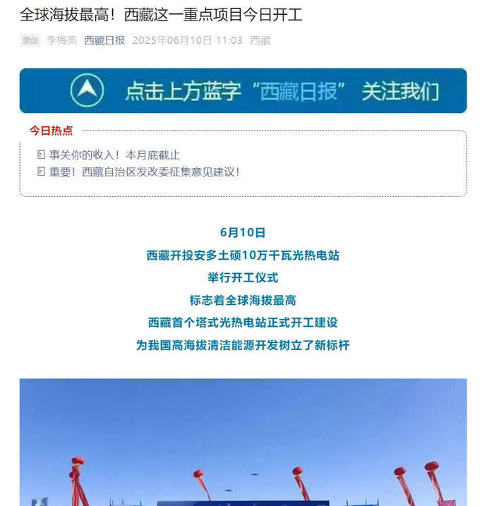 媒體報道丨全球海拔最高、西藏首個塔式光熱電站開工建設(shè)