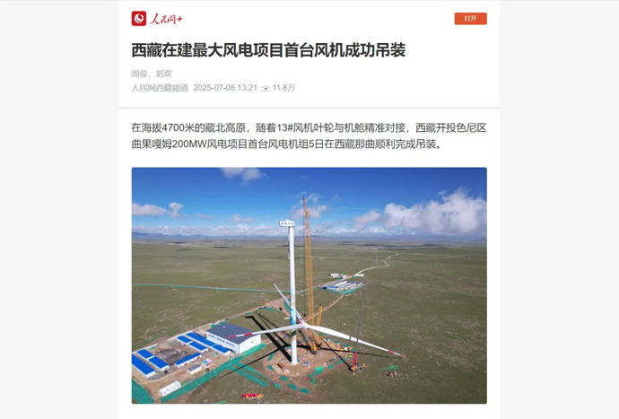 媒體報道丨西藏在建最大風電項目完成首臺風力發(fā)電機組吊裝