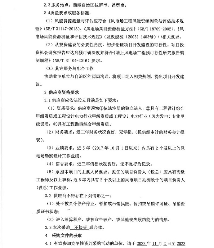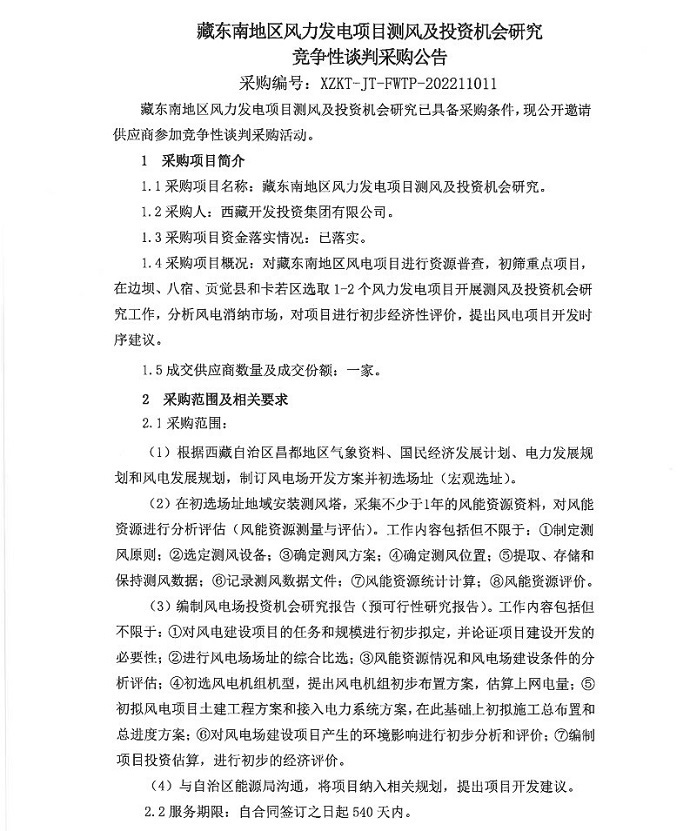 藏東南風(fēng)力發(fā)電項(xiàng)目測(cè)風(fēng)和投資機(jī)會(huì)研究競(jìng)爭性談判采購公告