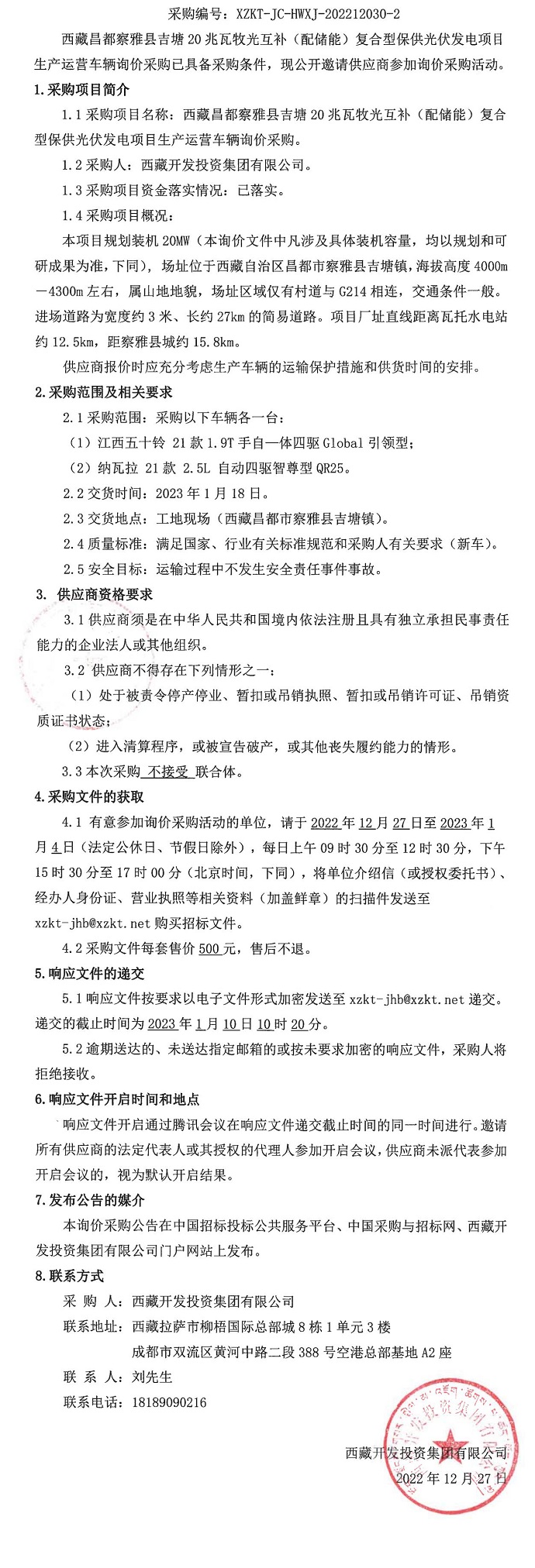 西藏昌都察雅縣吉塘20兆瓦牧光互補(bǔ)(配儲(chǔ)能)復(fù)合型保供光伏發(fā)電項(xiàng)目生產(chǎn)運(yùn)營(yíng)車輛詢價(jià)采購(gòu)二次公告