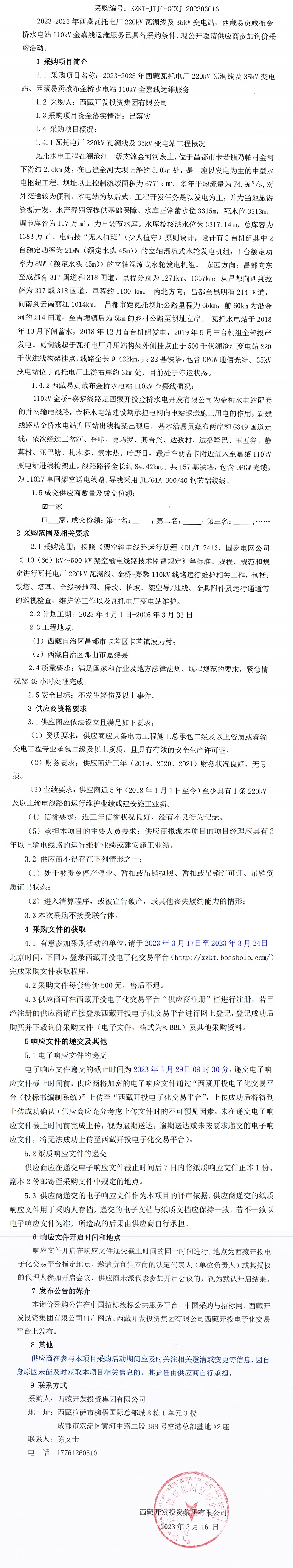 2023-2025年西藏瓦托電廠220kV 瓦瀾線及35kV變電站、西藏易貢藏布金橋水電站 110kV金嘉線運(yùn)維服務(wù)詢價(jià)采購(gòu)公告