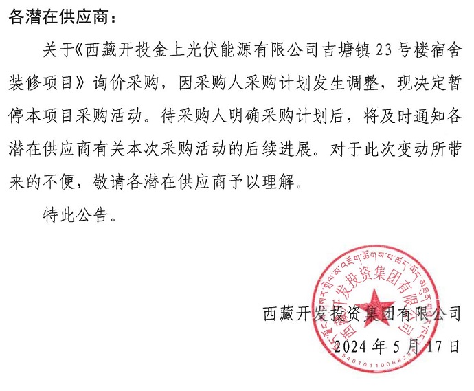 關于暫?!段鞑亻_投金上光伏能源有限公司吉唐鎮(zhèn)23號樓宿舍裝修項目》詢價采購活動的公告