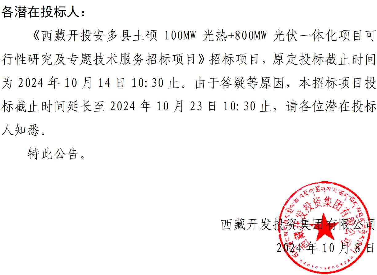 關(guān)于延長《西藏開投安多縣土碩 100MW光熱+800MW 光伏一體化項(xiàng)目可行性研究及專題技術(shù)服務(wù)招標(biāo)項(xiàng)目》投標(biāo)截止時間的公告