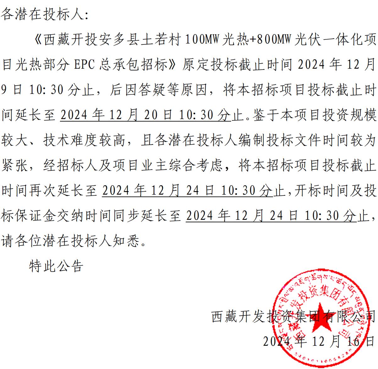 關(guān)于再次延長《西藏開投安多縣土碩 100MW光熱+800MW 光伏一體化項(xiàng)目光熱部分 EPC總承包招標(biāo)》投標(biāo)截止時間的公告
